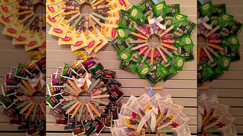 Instead of keeping colorful packets of tea hidden away in your pantry, turn these prime pieces of wreath-making items into art. You can use clothespins to arrange tea bags into a circular pattern or keep empty packages to glue in pleasing forms. Hot glue can be your friend if you're looking to create a piece that will have some longevity. You may want to keep displaying this creation near your kettle, as the whimsical decoration can also be considered as functional storage.