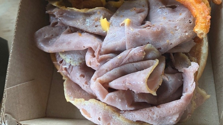 Sounds unappetizing? It's not quite as sinister as it sounds. The meat itself is raw — shaped into a solid brick. The gelatinous liquid is a water-based solution that helps keep the meat moist during Arby's three to four-hour roasting snd slicing process. While the process ensures consistency and juiciness, the visual of a rubbery, vacuum-packed log sitting in a gelatinous slurry isn't exactly hunger-inducing. And though the meat is real, not "liquid beef" as aforementioned viral claims suggest, it easy to see why online rumors about "liquid meat" just won't die.