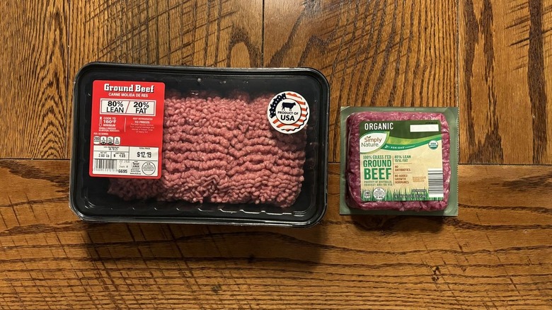 When it comes to pricing, this is where it gets interesting. Trader Joe's pricing of its ground beef varieties reflects more of what you'd expect, with its grass-fed ground beef costing a few dollars more per pound than its conventional counterpart. Over at Aldi, however, the grass-fed ground beef is often closer to the same price as its conventional ground beef when on sale — if not exactly the same price per pound. I also wanted to note that during my particular shopping trip, there was no single-pound option for conventional beef, so I had to purchase Aldi's 2-pound package. While it's not a problem (I was easily able to freeze the other pound for later use), I did have to pay for 2 pounds upfront. That's something to consider when you are budgeting and meal planning.