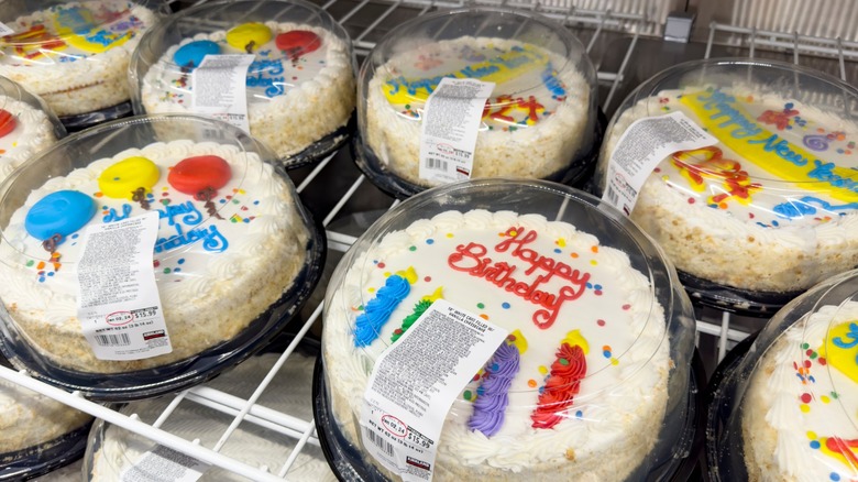 Costco is your absolute best bet for a large-scale, crowd-pleasing cake. There are a few things to know before ordering a custom cake at Costco. For one, you'll need to go to the store in person to fill out an order form, but the trip is definitely worthwhile. Though there may be some difference in price based on your specific location, generally speaking, a 10-inch round cake retails for around $16 and a half-sheet cake is approximately $25. The round cake offers about 16 servings and the half-sheet closer to 48 servings, which you can also have scored to make it easier to cut individual pieces. Though the customization options are more limited, the value is unmatched by any other store-bought offering.
