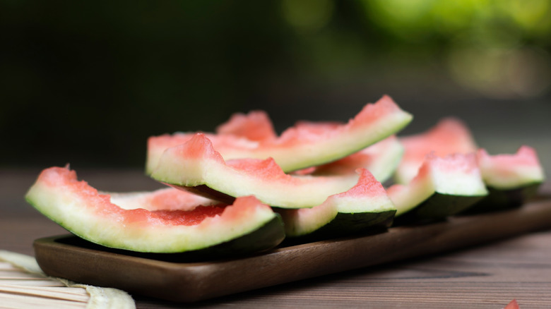 The rinds are not so palatable on their own, meaning that they may require some manipulation to look — and taste — the part. A pickled watermelon rind that's cut into slivers and preserved in a savory pickling liquid makes for the perfect accoutrement for a summer-ized "dirty" martini. However, if bright, acid-forward flavors aren't your thing, a candied watermelon rind would pair brilliantly with most classics, such as a julep, mojito, or fruit punch.