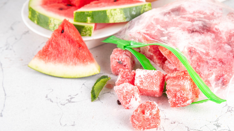 While it's a bad idea to refrigerate watermelon, if you're working with mealy or leftover fruit, cutting the flesh into chunks and then freezing them is a great way to repurpose those less-than-perfect melons. Watermelon makes a great candidate for freezing into cubes because of its sturdy yet soft structure. With porous flesh, watermelons have high levels of natural sugar and water, meaning that they'll soak up the boozy liquid well, while still having a relatively balanced flavor when you take a bite.