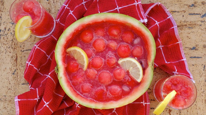 Whether on TikTok or YouTube, we've all seen the videos where somebody decides to cut a hole in a watermelon only to stick a bottle of booze in it. While that could boost the flavor of a bottom-shelf liquor served in plastic, I cannot in good conscience recommend such rough and rash treatment of the watermelon or the booze in question. But if a showstopper is what you're after, you can still suit your creative whims while pleasing your palate by turning your watermelon into an edible punch bowl.