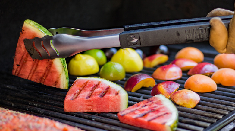 Summer cocktails won't just cool you off on a hot day. They're also refreshing pairings for the sizzling burgers you'll be pulling off the grill at summer cookouts. However, savory meats aren't the only dishes that benefit from being grilled. Your next summer cocktail needs a grilled fruit upgrade. Cocktail Instagrammer Katie Stryjewski, author of "Cocktails, Mocktails, and Garnishes from the Garden", agrees, telling us that, "grilling fruit adds a smoky flavor and also caramelizes the sugars, giving fresh fruit a sweeter, cooked flavor like pie filling." Rich caramelized grilled fruit makes the perfect spirit pairing as fruit, caramel, and smoke are common tasting notes in everything from whiskey to mezcal. The best news is that you can incorporate grilled fruit into a wide range of cocktails.