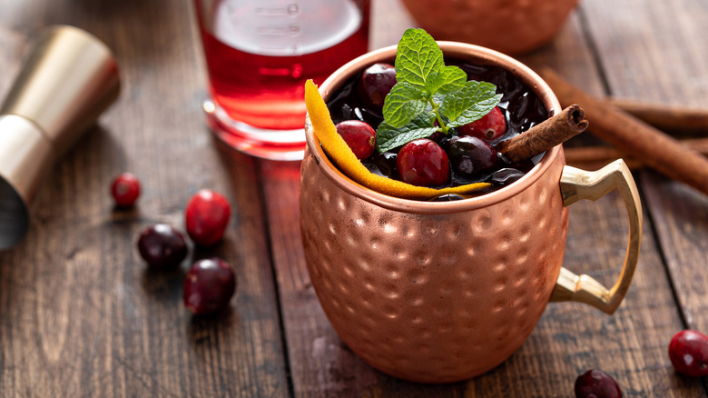 To come up with good fruit-and-botanical combos for your mules, start with that base spirit and think about what it plays well with, alongside the sweet heat of that ginger beer. The mule's original vodka is endlessly versatile because of vodka's neutral profile, so pretty much any concoction you come up with would work there. If you look at something more distinctive like woody, vanilla- and caramel-leaning whiskey, the ginger will cut its sweetness with heat, but the pairing could use brightness from orange or lemon. Bitters would add complexity and spice — look to the best bitters for whiskey-forward cocktails and get inspired by peach, vanilla, cherry, or apricot and smoked hickory varieties.