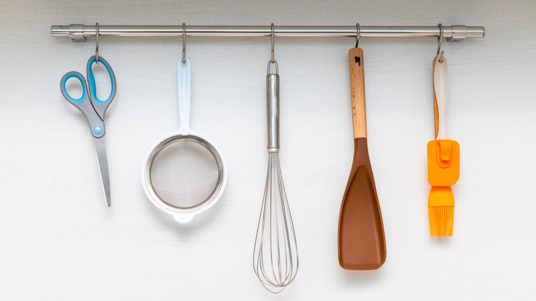 If you're tired of hearing your kitchen utensils roll around in a drawer, Stanley Tucci has the perfect hack for you. Though he doesn't claim to be a chef, the actor and food show host certainly knows his way around a kitchen. In his own home, Tucci opts to organize all sorts of kitchen utensils on a bar above his stove. This rail, which is typically used to hang pots, is admittedly a versatile option to add to your kitchen.