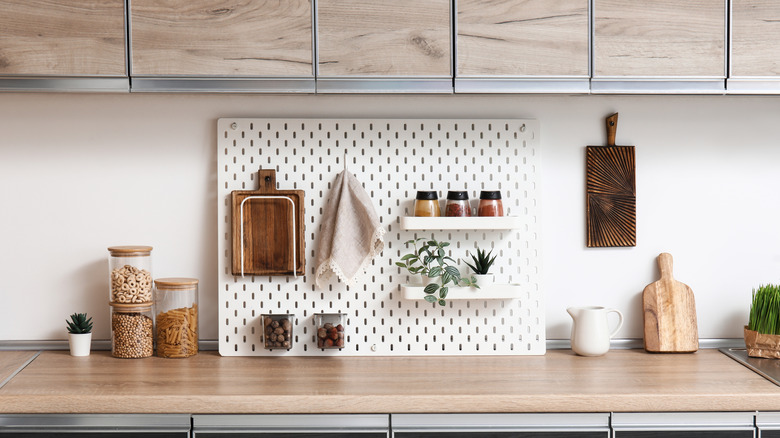 Rather than attaching the Command hooks directly to your wall for storage, place them on a blank board first. The board can be colorful, patterned, or even made of metal, to help draw the eye to the board rather than the hooks that are on it. Attach your Command hooks to the board in a diamond pattern that mimics a pegboard. Then, you'll have the perfect spot to hang all of your kitchen supplies. Better yet, a Command hook board is much easier to move around all at once, rather than removing and relocating dozens of small hooks.