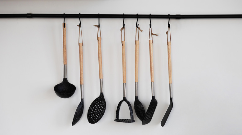 If you want to mount a temporary kitchen rail for extra storage, you can do so using Command hooks. Look for a circular rod or dowel that will be sturdy enough to hang items from — it should be an appropriate size for hanging S hooks, for example. Place two Command hooks on your kitchen wall where you want your rail to be; the length between them should be a bit smaller than the length of the rod you're using.