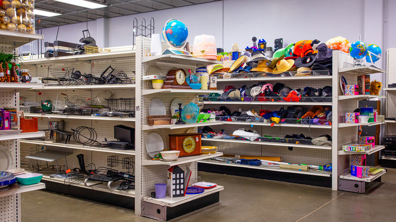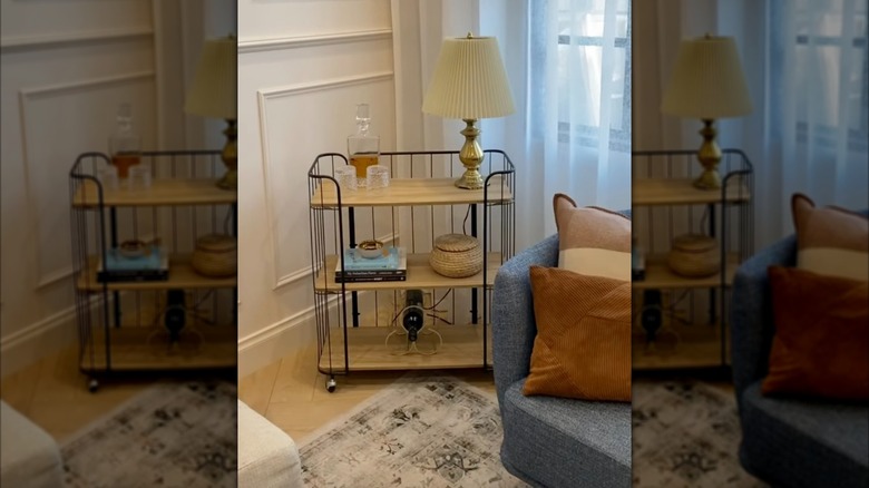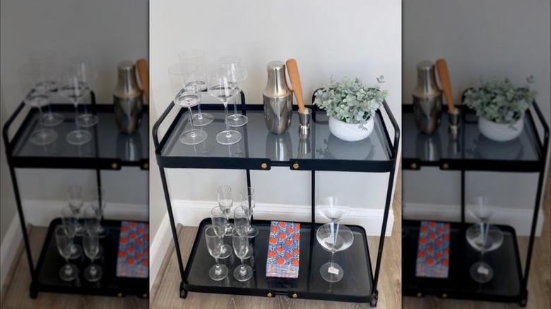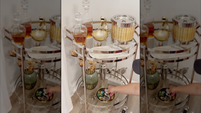 Also, thrifting is somewhat of a treasure hunt, and you may find a stunning and rare antique piece to style your bar cart with — whether it's vintage storage jars, a clock, or some other decorative doodad. Thrift stores are great places to snag everyday functional items, like trays, a small wire wine rack, and even a ceramic planter that you can use to decorate the cart. Seek out items that hit other design elements we covered, such as those that fit your color scheme or those that are made with a specific material. You never know what you may find.