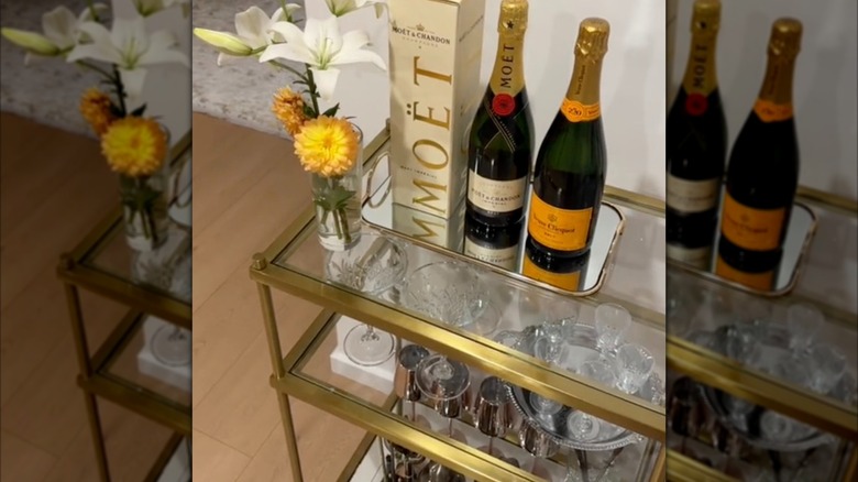 One of the simplest ways to decorate a bar cart is to use a decorative tray of some sort. This helps bring a visual break, especially if you're working with a lot of glass bottles or wine glasses. A tray also looks good alongside other styling essentials, like a coffee table book, candles, or flowers. Place liquor bottles or bartending tools on the tray and pick a design that works with the rest of decor. For something colorful and bold, find inspiration from Dolly Parton's kitchen and use a tray with a floral design. If you prefer something sleek and simple, opt for a mirrored tray or a silver one.