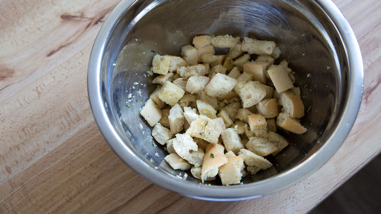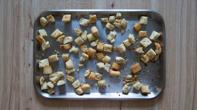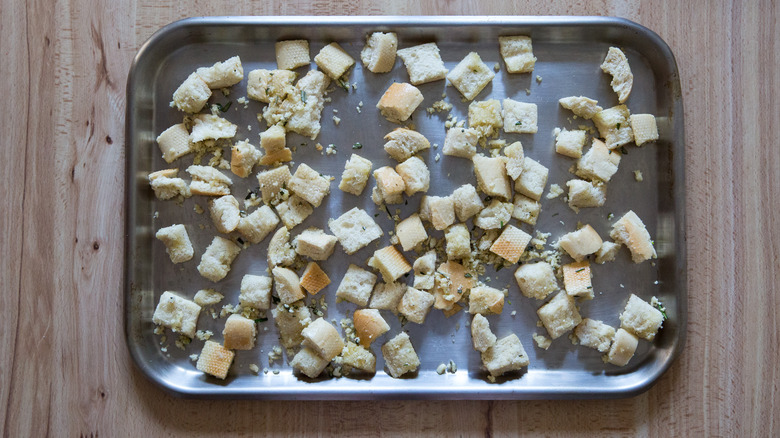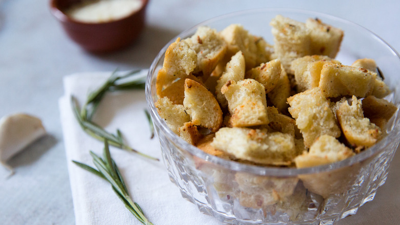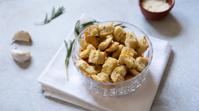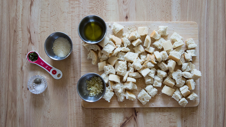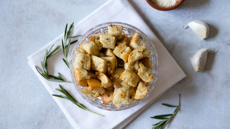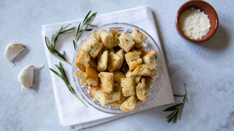One way to customize these croutons is by going big on the added flavors — double the amount of garlic and Parmesan cheese to create a richer version of the same croutons. Keep the amount of the other ingredients the same. You'll need to add a little more olive oil to help the bread soak up the extra flavorings, and massage them into the bread with your fingers to help them adhere. Instead of two cloves of freshly crushed garlic, you can choose to use ¼ teaspoon of garlic powder, and instead of 1 teaspoon of chopped fresh rosemary, you can substitute ¼-½ teaspoon dried rosemary. If rosemary isn't available, fresh parsley or fresh or dried thyme and oregano would work, or you can use dried Italian seasoning.