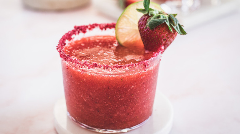 This fruity mix-up takes the classic strawberry daiquiri and transforms it into a frosty delight, making it the perfect sunny day sip. First, you'll add frozen strawberries, ice, Grand Marnier, rum, simple syrup, and lime juice to a blender. Then, simply blitz everything up until nice and smooth. There's also the option to make an alcohol-free version of this drink by substituting the Grand Marnier for orange juice. Garnish your daiquiri with some fresh mint leaves and a dried orange round for the ultimate elegant finish.