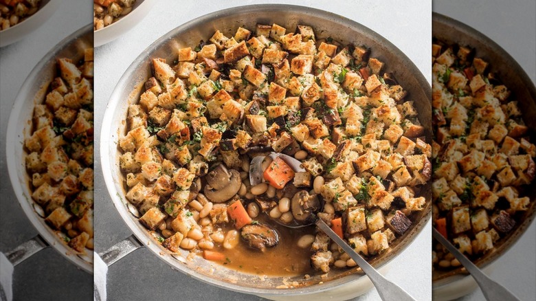When you hear the words "au gratin," you're likely thinking of potatoes. Though this might be one of the best known recipes for au gratin, the term refers to any food prepared by topping it with cheese and/or bread crumbs and then browning and crisping it with butter either in the oven or under the broiler. You can easily give canned baked beans a fancy au gratin twist or use other types of beans. If you want to remove cheese from the equation, simply whip up a batch of "Poor Man's Parmesan" with olive oil, salt, parsley, and bread crumbs as a convenient swap. You can pair just about any type of beans to your favorite au gratin preparation to make a flavorful dish filled with the comforts of a slow-cooked meal.
