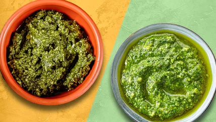 In the simplest of terms, pistou is like the French cousin of Italian pesto as both sauces include basil and garlic that are pounded down with olive oil. The main difference between them is that while pesto includes pine nuts, pistou does not have any nuts in it. The omission of pine nuts in pistou has to do with the origins of the French sauce. Due to the lack of pine trees in the Provence region of France where the sauce comes from, there were no nuts available locally and therefore weren't part of the ingredients list. Additionally, pistou doesn't always contain cheese. Unlike pesto that includes parmesan, pistou may even swap in aged varieties like gruyere or gouda.
