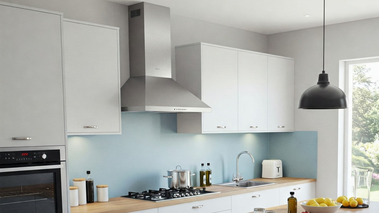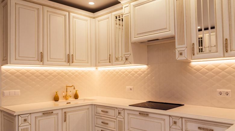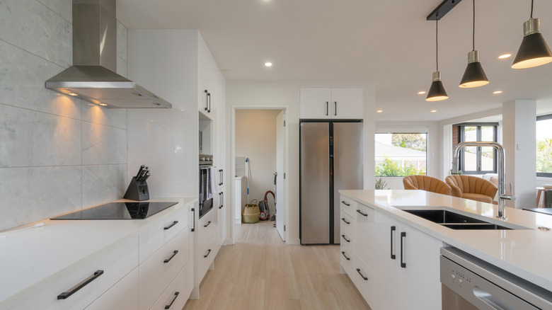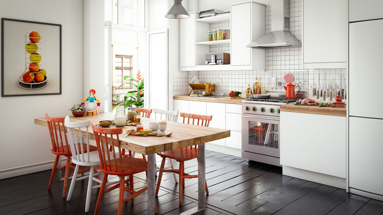 Maybe you're tired of prepping meals in a shadowy corner, are trying to make your kitchen seem larger, or you're just sick of cooking in a room that feels like a haunted house — whatever the reason may be, it's easier to brighten up a dim, windowless kitchen than you might think. In this list, we'll explore a few tips to add a sense of invigorating light into a dark kitchen. Some of these tips involve reworking your room entirely, so you can start cooking and eating in a bright, fresh space. Other tips are budget-friendly and can be done in a day — no remodeling required. So, let's dive into these tips for the window-deprived among us, and quit cooking in the shadow realm.