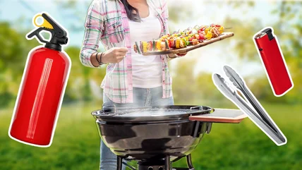 If you're grilling at home, then it's important to set up your space with the proper safety gear. Once you've chosen a safe place to set the grill, you'll want to go out and purchase a fire extinguisher or fire blanket. Grease fires are difficult to put out, and water is not an option for extinguishing the flame, as it could make matters worse. Instead, you'll want to turn off the grill if it's safe to do so, close the lid to cut off the oxygen supply, and then, if the flame is still out of control, use a fire extinguisher or fire blanket. This will help you to safely extinguish a grease fire.
