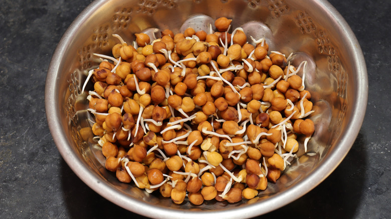 To sprout them, soak dried chickpeas overnight (they should double in size), then drain, and rinse twice a day. Keep them in a jar with a mesh lid or in a sieve inside of a bowl. You'll see short tails after 2–3 days. Sprouted chickpeas can be eaten raw (or lightly steamed for food safety reasons), blended into hummus, tossed into salads, or roasted for a crunchy snack.