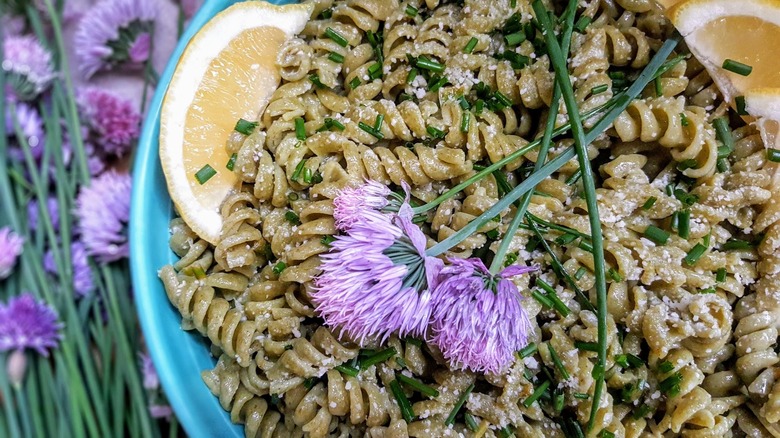 Chives are another one of my favorite crops to grow indoors — and once you have a little pot going, you'll wonder how you ever managed without them. With their fresh, mild onion flavor and tender green shoots, they have many different uses. I love snipping them before serving for that pop of bright green color — and their purple blossoms are edible and absolutely gorgeous when they bloom. I love using the blooms as a dramatic garnish.