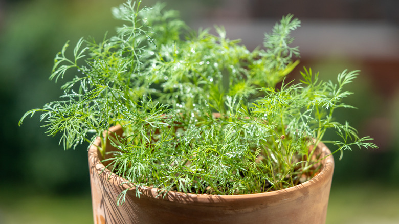Start dill from seed in a deep pot (its taproot doesn't love transplanting), and keep it in a sunny spot with well-draining soil. It germinates in about 7–10 days. Dill likes full sun and regular watering, and it's best harvested young when it's about 6–8 inches tall. You can trim the leaves as needed or cut the whole plant if it's starting to flower.