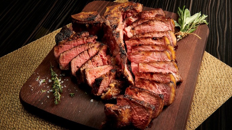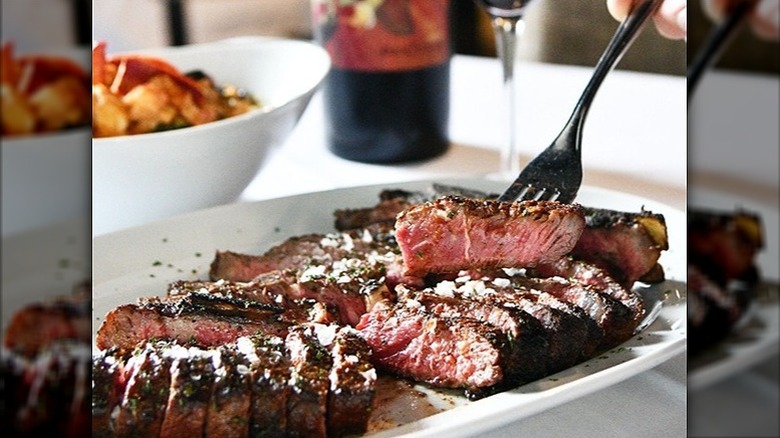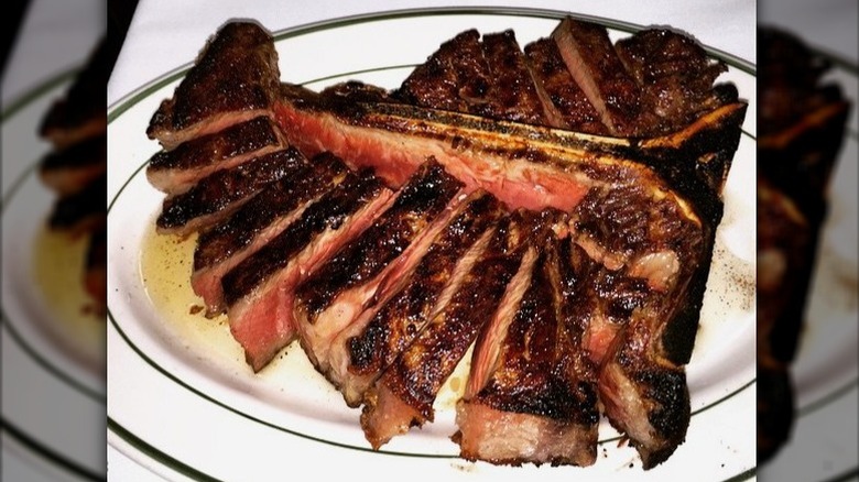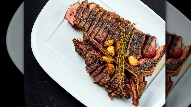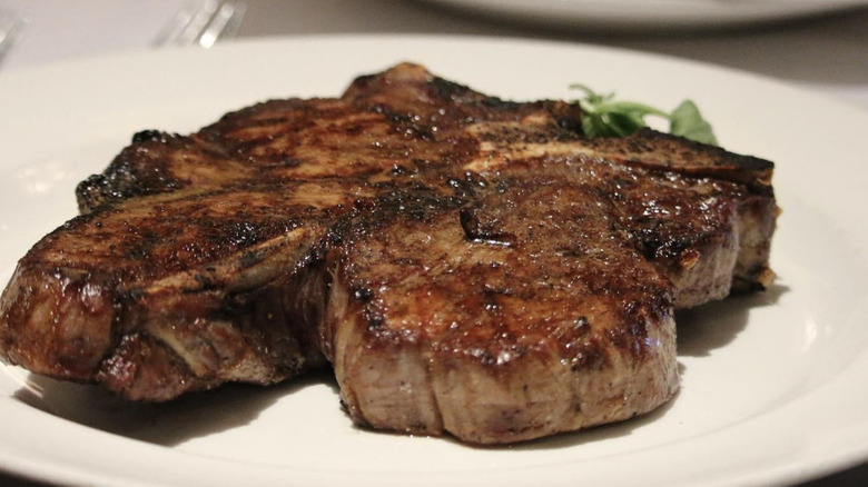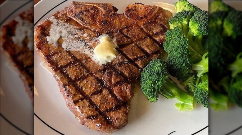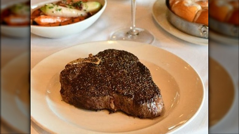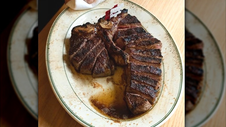 Mastro's, which has locations across the U.S., enforces a strict dress code. This high-end restaurant, which offers an upscale dining experience, serves a prime 24-ounce porterhouse for patrons to share (or not). Though Mastro's offers other top-notch cuts, like dry-aged ribeye, Japanese wagyu New York strip, and filet mignon, the restaurant places relatively low on our list because reviewers indicated a difference of opinion as far as the porterhouse was concerned — some customers loved it, while others didn't favor it as much, citing it as inedible or just okay.