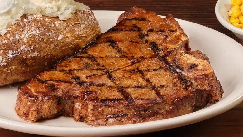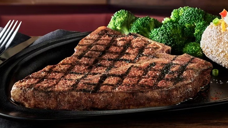 Texas Roadhouse is one of our favorite spots to grab a ribeye, but how does its 23-ounce porterhouse T-bone stack up against those at other popular steakhouse chains? In Tasting Table's ranking of Texas Roadhouse's signature steak cuts, the tester declared the porterhouse a solid choice — impressive in terms of its size and visual appeal. There was a generous amount of tender, easy-to-slice meat on both sides of the T-bone, though our tester noted it would have been better with more marbling throughout and a fresher flavor, as it tasted slightly past its prime. They also found it a bit pricey for the overall quality.