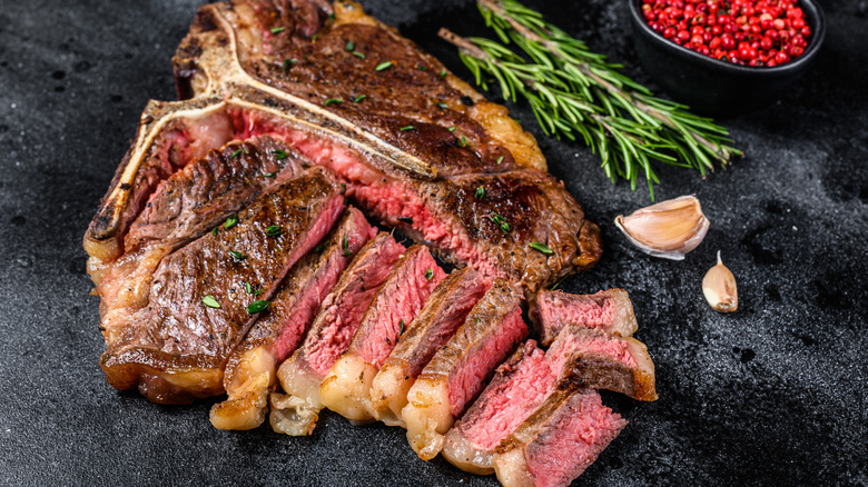 The porterhouse steak is a colossal, beefy cut that combines buttery filet mignon (also known as tenderloin) and hearty New York strip, which are divided by a T-shaped bone. It's sometimes confused with the T-bone cut, though the porterhouse is a bit larger. It comes from the short loin of the cow, from the area just behind the ribs. Per the USDA, the tenderloin side has to be at least 1.25 inches wide, whereas the tenderloin on the T-bone only needs to measure 0.5 inches. A porterhouse can weigh more than 2 pounds, making it an impressive piece of meat often shared by two or more people.