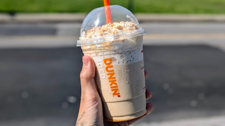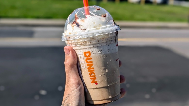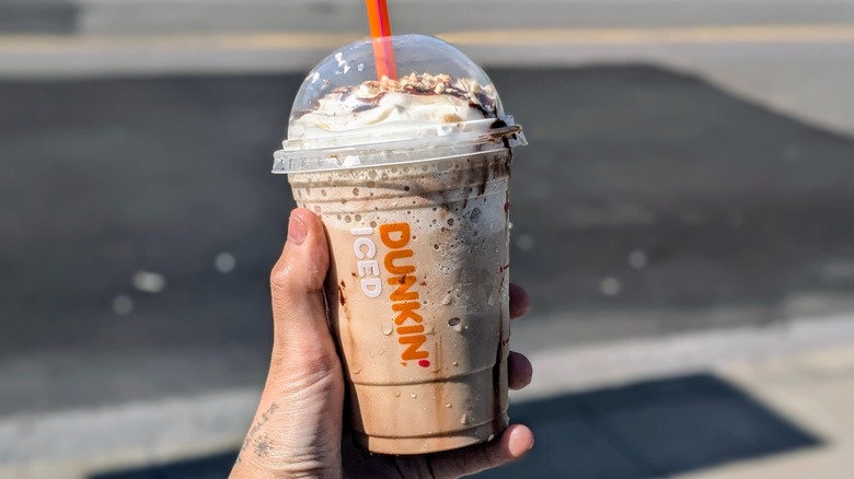 Mint chocolate chip is somewhat of a contentious, love-it-or-hate-it ice cream flavor, but it just so happens to be my personal favorite. Fresh mint and rich, dark chocolate are a match made in dessert heaven — they're a prime example of opposites attracting. If you choose a medium-sized Mint Chocolate Chip Frozen Coffee at Dunkin', you can expect 122 grams of sugar, 132 grams of carbs, 95 milligrams of cholesterol, 250 milligrams of sodium, 31 grams of fat (18 of which are saturated fat), and 830 calories.