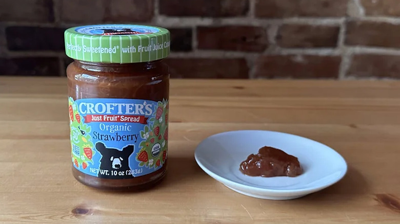 Whenever strawberry season comes around, you might be tempted to finally conquer your fears and try to recreate a simple yet delicious strawberry jam recipe. After all, how hard can it be? Well, it takes a lot more patience and effort than you think, especially when pectin, aka your secret weapon to making a luscious batch of spreadable fruity goodness, is involved. Hence, most people prefer to go to a local farmer's market or grocery store to fulfill their jammy needs. Plus, it's easier and cheaper to peruse the jam aisle, then to buy, dice, cook, and cool ingredients for a homemade jam. Luckily, there are plenty of brands that sell various iterations of this delectable strawberry spread. However, not all versions have the same level of deliciousness. While some store-bought jams can benefit from a fun, tasty upgrade, others are so flavorsome that they can elevate your jam-eating experience on their own. One brand that's guilty of the latter is Crofter's organic strawberry fruit spread.