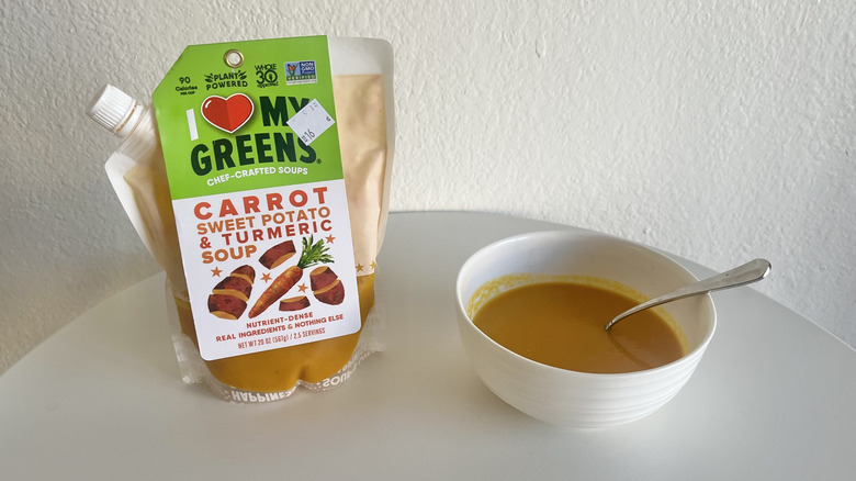 Here we are with another I Eat My Greens option. This time around, it's the carrot, sweet potato, and turmeric soup, which is mildly sweet compared to its zucchini-filled vegetal counterpart. It is a minimal ingredient veggie dish, and yet it's rich and flavorful. While other soups rely on add-ins, like corn and quinoa, this has carrots and sweet potato as the leading stars — both of which give it a hint of natural sweetness.