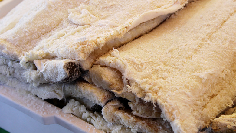 Bacalao, also known as salted cod, may not be the most common type of fish you'll see at an average American supermarket, but if you can get your hands on some at a specialty seafood market, you're in for a real treat. Cod itself isn't a particularly flavorful fish on its own — rather, it's known for its mildness along with a beautifully flaky texture that means it breaks apart easily: perfect for a salad. Salted cod, on the other hand, is saltier, of course, but also richer in flavor and more complex, offering a dynamic base to your seafood salad.It's a great alternative to tuna when you really want to up the savory flavor ante in your dish.