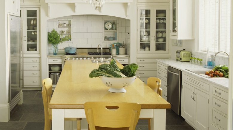 In order to achieve optimal kitchen organization, Stewart says in her interview with Frederic, "First of all, take as much space as you can from the rest of the house. Space is important, no matter what." When you find a way to free up space in your kitchen by borrowing it from other areas of your home, you create a more functional workspace and more harmonious flow. One of the best ways to do this is to store large or rarely used kitchen appliances in your dining room or a closet or pantry near the kitchen so that you open up countertop space and cabinet space. You can also store seasonal kitchen items like holiday dish sets in your garage or shed.