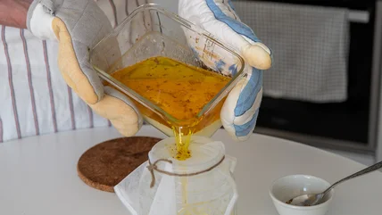 Use a fine strainer or a double layer of cheesecloth to strain the ghee into the jar (or jars) you'll be storing it in. Hassan notes that jars used should always be totally dry, as "water and ghee don't mix well." Or at all, really, given that ghee is clarified fat. It's also a good idea to fill jars as close to the top as possible and use several smaller jars rather than one large one. If there's a lot of air trapped in with the ghee, it might reduce the vitamin content. If you have multiple jars, you can always open one and store the others for later use.