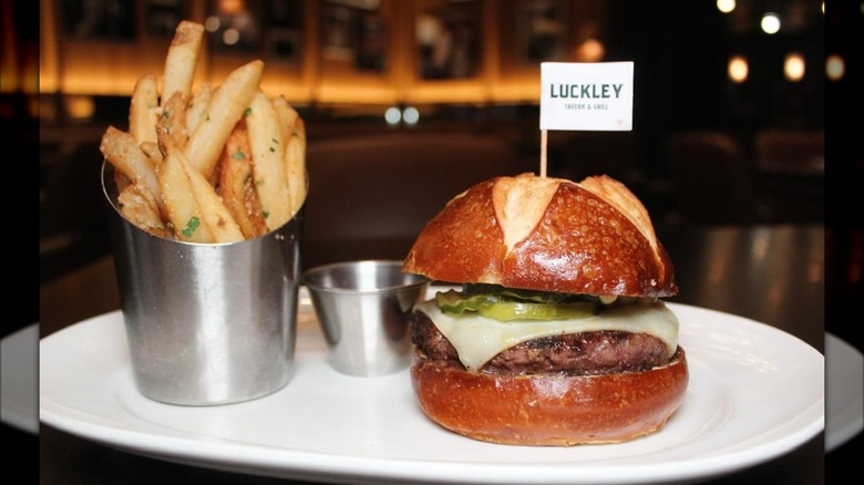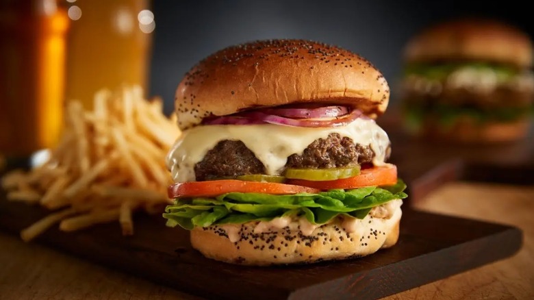 This one's a little different in that you'll have to show up late in order to take advantage of the burger deal at Lazy Dog. Happy hour runs from 3 to 6 p.m., and there are a ton of deals on drinks and appetizers. There's a happy hour 2.0, too, that runs from 9 p.m. to midnight, and it's during this time frame that the all-American cheeseburger makes an appearance on the menu. It's also worth noting that Lazy Dog is a chain, and its offerings are all subject to change.