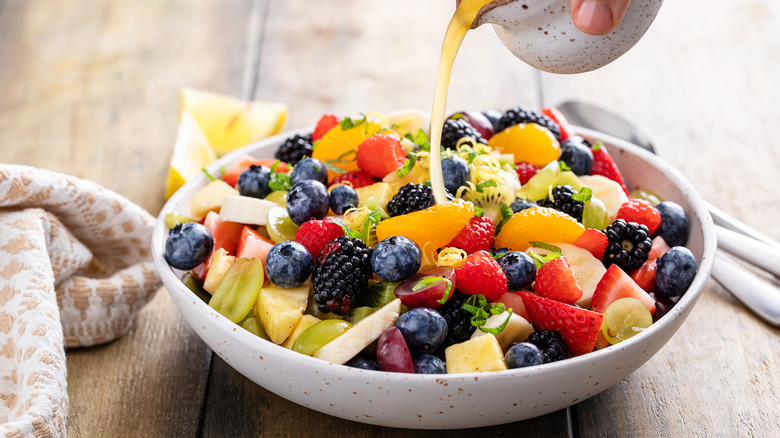 In addition to the comforting, luxurious, sweetness, honey is also a natural humectant, meaning it absorbs and holds moisture. When drizzled onto or mixed into fruit salad, it creates a light coating on the fruit pieces that slows down oxidation — the process that causes fruits like bananas, apples, and pears to go brown when exposed to the air. This thin but effective barrier also helps to lock in the fruit's natural moisture because of the hygroscopic nature of honey and the high concentration of sugar, preventing it from drying out or turning mushy. Honey also elevates the natural sweetness of the fruit because of the levels of fructose and glucose in it, allowing the bright flavors of berries, melon, citrus, and stone fruit to shine through. A simple dressing of honey and citrus juice not only balances sweetness and tartness, but it also extends the fruit salad's shelf life, making it perfect to pack up for picnics, barbecues, or a healthy snack in between meals.