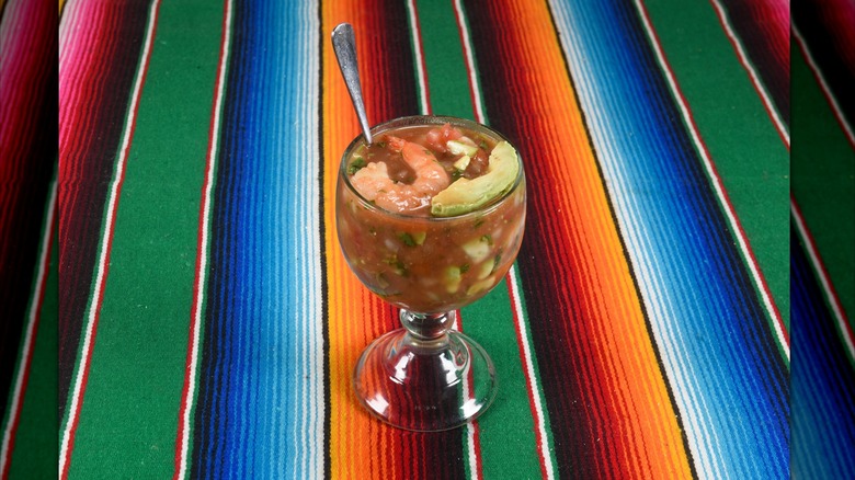What makes this version different from the classic is how it's prepared. There's cooked shrimp, of course, but then the cookbook author says "punchy bites of red onion, jalapeño, and chunks of creamy avocado are added to a zingy shrimp cocktail sauce made with V8." Yes, V8, that well-known vegetable juice you can find on grocery store shelves everywhere. While you could enjoy this dish all by itself, it's frequently served with crackers or chips, turning it into a filling meal perfect for the dog days of summer.