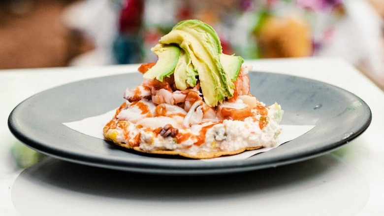 What makes these tostadas stand out is how they're made. Yes, they're topped with a variety of seafood and ceviches, but the Venegas says the secret is the sealant. Before any seafood is piled on top of the crispy, flat tortilla shell, Venegas explains that La Guerrerense makes a spread out of sea urchin and smoked marlin, or whatever fish she's in the mood to use. She spreads that over the tortilla, then piles shrimp ceviche on top and drizzles the whole thing with her own special sauce, creating a dish Venegas says is "so tasty."