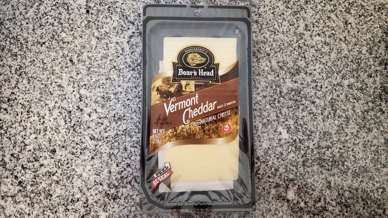 While I enjoyed many of the other cheeses from Boar's Head, this Vermont cheddar was the best, in my opinion. It has a really satisfying cheddar flavor, that I would classify as medium sharp. Unlike a few of the other cheeses that were a bit sticky and difficult to peel off of the paper separating the slices, this one came off easily without tearing. Boar's Head just seems to have cheddar cheese perfected — its Irish cheddar block cheese was towards the top of our ranking of the best store-bought cheddar cheeses. As our taste tester shared about the Irish cheddar, this Vermont cheddar also has a nice richness to it that made it all the more enjoyable.
