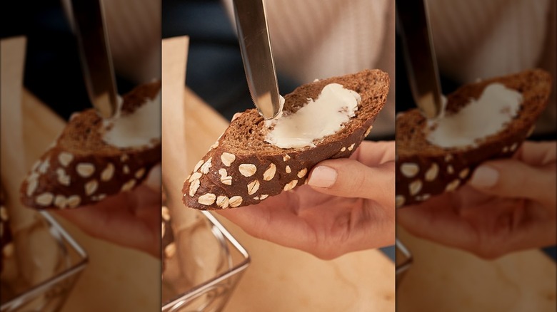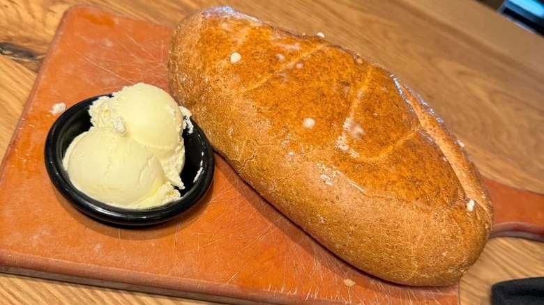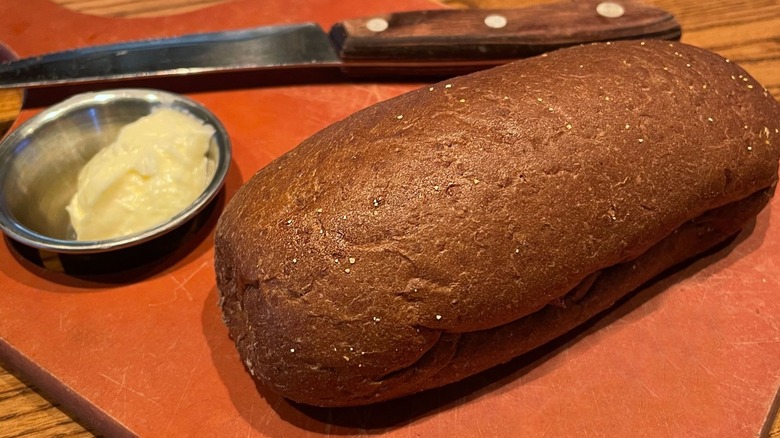 The bread that most people think of when it comes to Longhorn Steakhouse is the rustic artisan bread. The crusty loaf is slightly sweet, features seeds and oats, and comes to your table warm and soft with whipped butter. According to a former Longhorn employee, you can also ask for cinnamon sugar butter, which is made from the ingredients used to flavor sweet potatoes. Several seasonal and regional offerings also include a brown and slightly sweet honey wheat bread. And while a few dishes come with buttery garlic toast, you won't see that coming to the table for everyone in a free bread basket.
