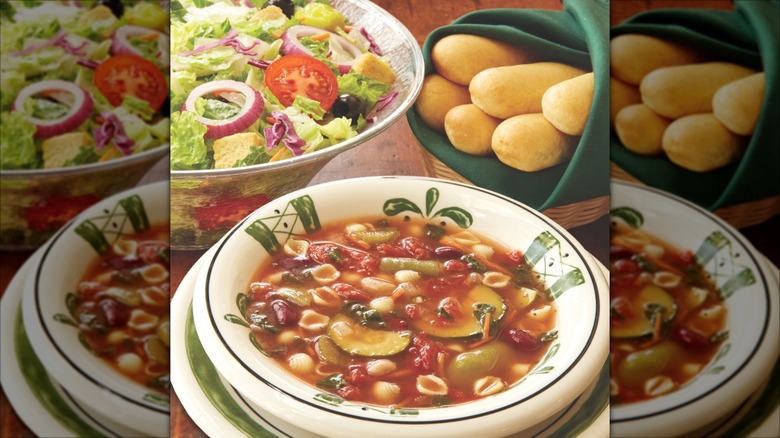 Quite frankly, when we think of Olive Garden, we're mainly nostalgic for the freebies. The breadsticks are warm and toasty, with garlicky butter and parmesan. And when we ranked the free bread selection at 15 chain restaurants, Olive Garden's bread came out on top. The salad is fresh, as well, coming with lettuce, tomato, red onions, banana peppers, crunchy croutons, and lip-smackingly good Italian dressing. If you choose soup instead of salad, you have your choice of chicken and gnocchi, pasta e fagioli, or minestrone soups, along with our personal favorite: zuppa Toscana.