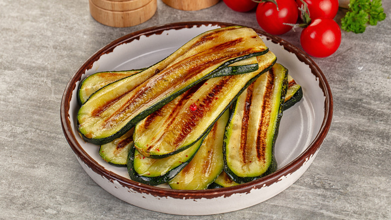 Given zucchini is in season during the summer months, it really doesn't require much effort on your part to taste good — just make sure you're reaching for smaller-sized zucchinis at the store, as they'll be the least bitter. After cutting them correctly and drizzling them with olive oil, a good place to start is giving the planks a hit of salt and pepper on both sides. They really don't need much more than that, but you could play around with other seasonings such as garlic or cumin. Don't go too overboard, though. You want its natural, peak-season flavors to shine.