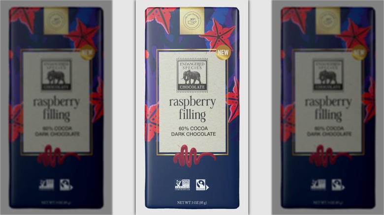 The other bar from Endangered Species Chocolate that piqued our interest was its raspberry-filled dark chocolate bar. This particular product is packaged in a starfish-adorned wrapper, and it's made of 60% cocoa and a vegan raspberry filling. Adding fruit to the classic s'mores recipe is nothing new, and when the fruit is already inside the chocolate bar, it's much more convenient.