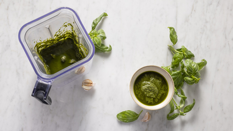 Both dry and canned chickpeas are alright for this trick (just make sure to avoid Iberia's garbanzo chickpeas, our least favorite brand if you go for canned). Simply crack the can, drain, and spread the chickpeas on a baking sheet. Then, pop them into a preheated 325 degrees Fahrenheit oven until they're tender and golden (it should take about 30 minutes or so). All that's left to do is whizz the chickpeas together with the rest of the pesto ingredients in your blender or food processor.