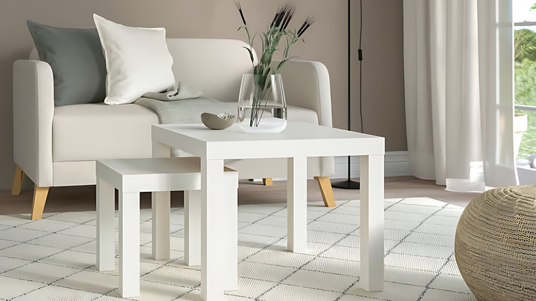 Here's how it works: you stack two LACK side tables one on top of the other, securing them together with wood glue or brackets. Some people add a third tabletop between the legs to act as a lower shelf for storage — perfect for bowls, baskets, or even your microwave. Others cut slats from scrap wood or use a spare Ikea shelf instead. To finish, simply cap the top with a butcher block, marble-look adhesive film, or even a VIKA tabletop, and you've got yourself a stylish little workstation that didn't require a full renovation.