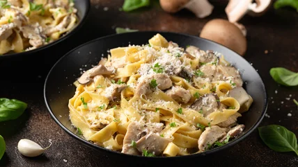 Carbone's Alfredo is a very rich sauce, so you can always thin it out or temper its intensity with a ladle or two of starchy, salted pasta water. The best types of pasta for classic Alfredo sauce are flat and broad pasta shapes like pappardelle and fettuccine, but tube-shaped pasta like penne and rigatoni are also good options. If you want to keep with the gluten-free theme, we've got a ranking of gluten-free pasta brands to try; our favorite brand, Taste Republic, offers fettuccine. Make your Alfredo pasta a more well-rounded meal by adding a protein like chicken or shrimp and veggies like broccoli or mushrooms.