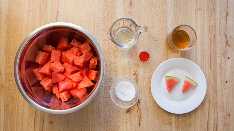 To make the two cocktails this recipe yields, you will need three cups of cubed watermelon, an amount you should be able to get from any standard-sized watermelon (with plenty leftover for snacking). The other ingredients you will need are water, granulated sugar, bourbon, and Angostura bitters, plus a couple of (optional) watermelon wedges for garnish.