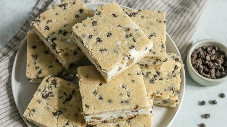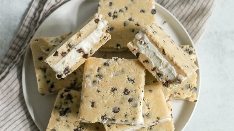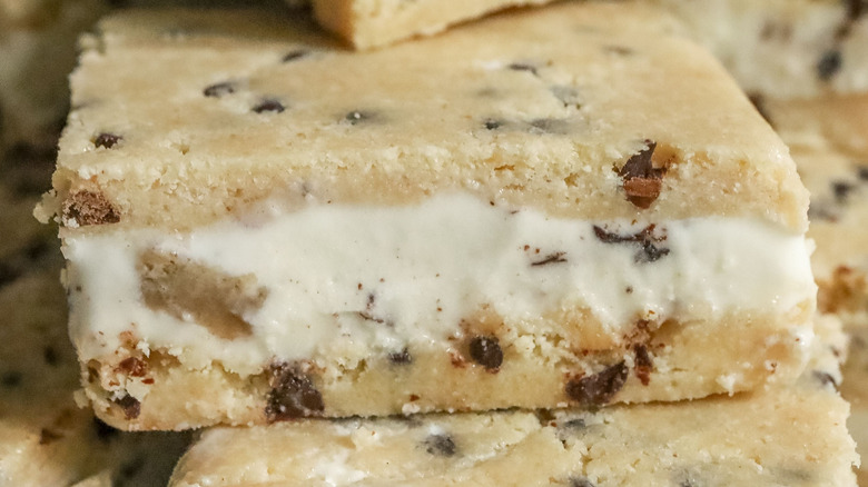 Sneaking bites of cookie dough has probably been around as long as there have been cookies, but edible cookie dough — meaning dough that was specifically designed to be safely consumed raw — wasn't really a thing until the end of the 20th century. It remains popular today, as proven by this cookie dough ice cream sandwich recipe, courtesy of recipe developer Jessica Morone. Not only do these ice cream sandwiches feature cookie dough as the "bread," they also feature cookie dough ice cream in the middle to truly double-down on that doughy goodness.