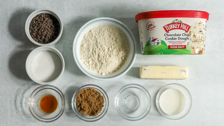 The edible cookie dough for the ice cream sandwiches is made from butter, sugar (both brown and white), milk, vanilla extract, salt, coconut flour, and mini chocolate chips. For the filling, we're using cookie dough ice cream, although you can swap it out for any other flavor you prefer.
