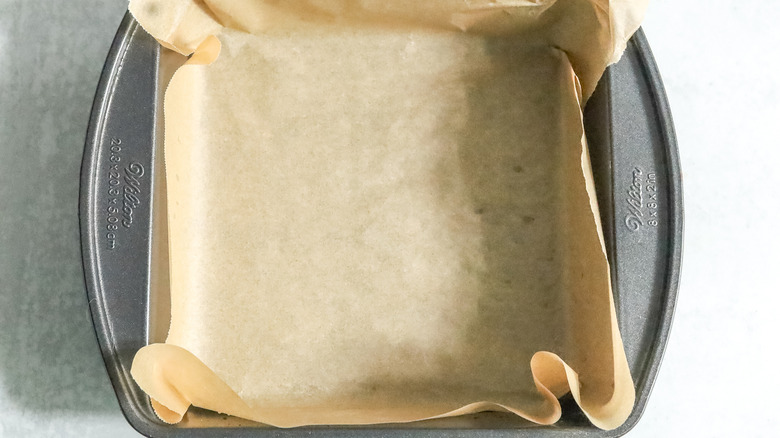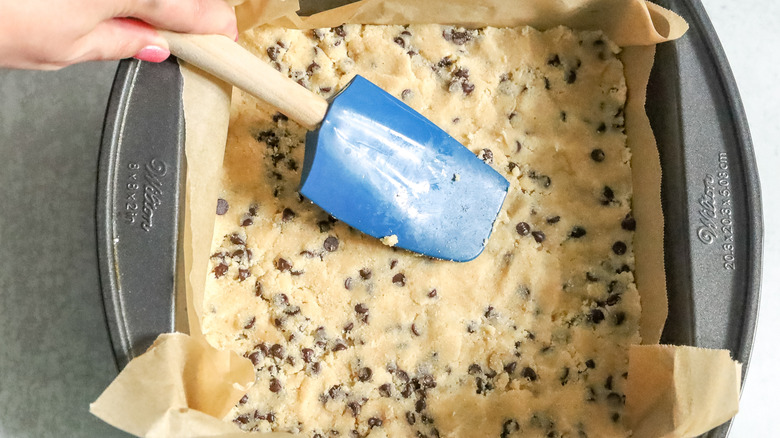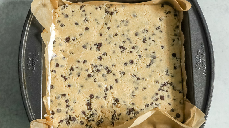 - Divide the dough in half and press each half into a parchment-lined pan. Chill both layers in the fridge for about 30 minutes, until firm.