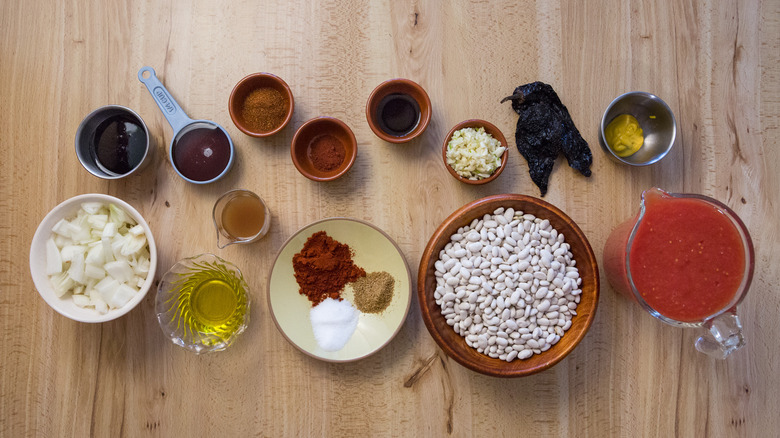 For this recipe, you will need dried white beans like navy beans or cannellini beans. The spices you need are dried ancho chile peppers, smoked paprika, chili powder, cayenne, cumin, and salt. Grab some olive oil, yellow onions, garlic, and tomato puree as well. A far as condiments, have apple cider vinegar, yellow mustard, and Worcestershire sauce on hand. Make sure the Worcestershire sauce is a vegetarian/vegan variety made without anchovies for a fully plant-based dish. Finally, baked beans are known for their sweetness, and in this case, you'll need molasses and maple syrup. You can sub brown sugar for the maple syrup if needed.