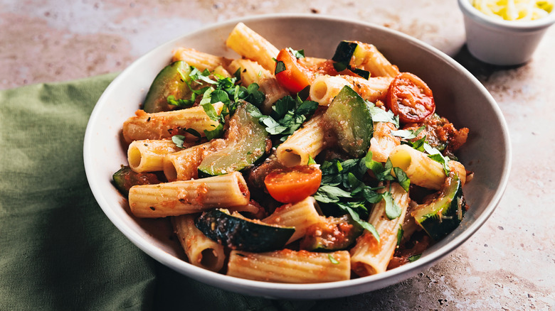 One salt that should be avoided is Himalayan salt since it contains less sodium per serving and has an elevated price point compared to table salt. The beloved pink salt mined near the Himalayas in Pakistan is known to contain a multitude of trace minerals — including iron oxide which gives the salt its quintessential pink color — but, it generally comes in rock form and is better used as a finishing salt for steak or adding into other dishes. Though it does have a more complex flavor profile than other salts due to its natural harvesting and minimal processing, it's subtle mineral flavors will be hard to perceive in the cooked pasta, and much of the salt will remain in the cooking water anyway.